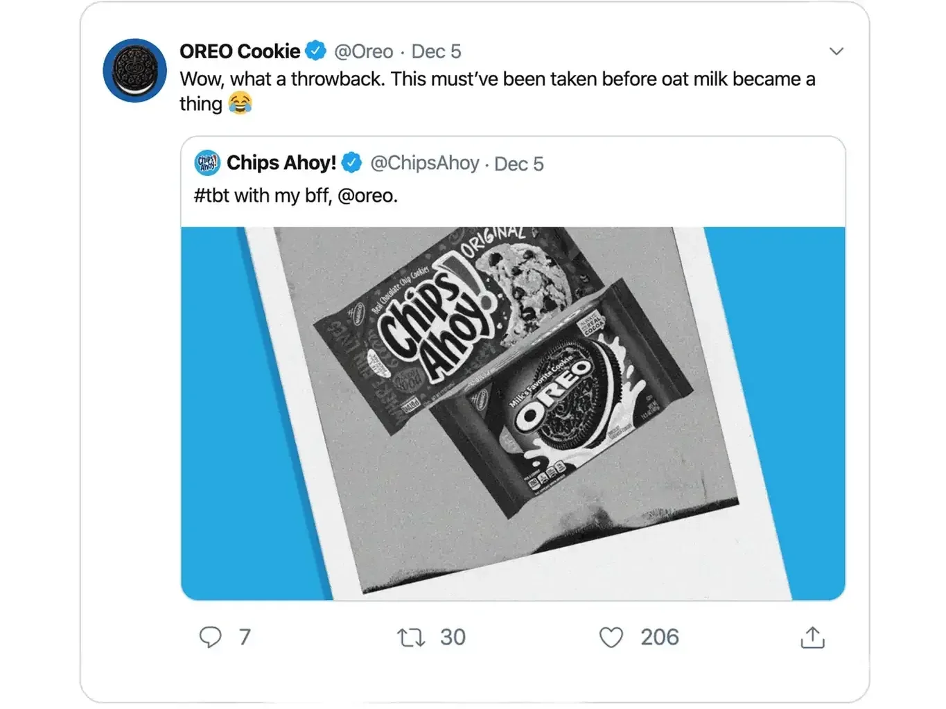 One sure way to get your audience on board is to banter with other brands. The Oreo social media team are always on hand to banter with other well-known brands, using humour to cross-market their products.
